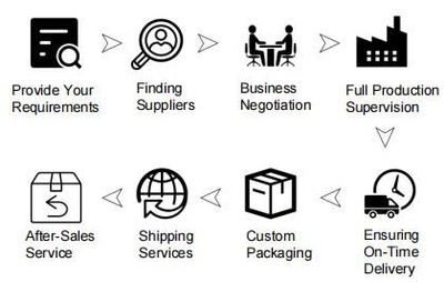 requirements. We’ll assist you in selecting the right products, negotiate pricing and terms, and verify suppliers for quality and compliance. After confirming your order, we’ll manage production, quality control, and shipping, ensuring timely delivery. Our team provides continuous after-sales
